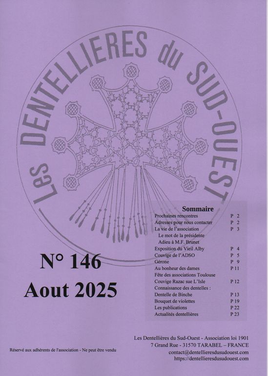 N° 146 – Août 2025 Prochaines rencontres Adresses pour nous contacter La vie de l’Association – Le mot de la présidente – Adieu à M-F. Brunet Exposition du Vieil Alby Couvige de l’ADSO Gérone Au bonheur des dames Fête des associations – Toulouse Couvige Razac-sur-l’Isle Connaissance des dentelles : dentelle de Binche Bouquet de violettes Les publications Actualités dentellières | ![]() |